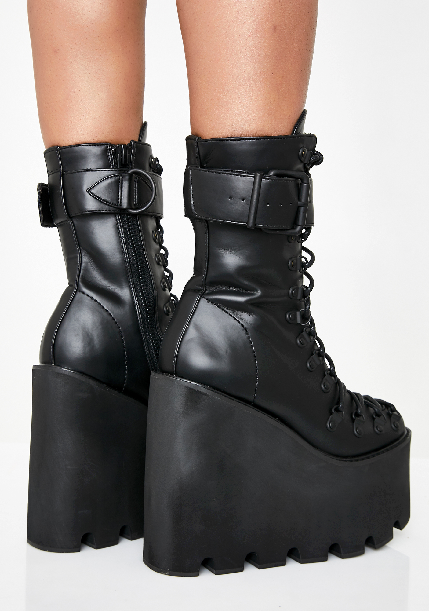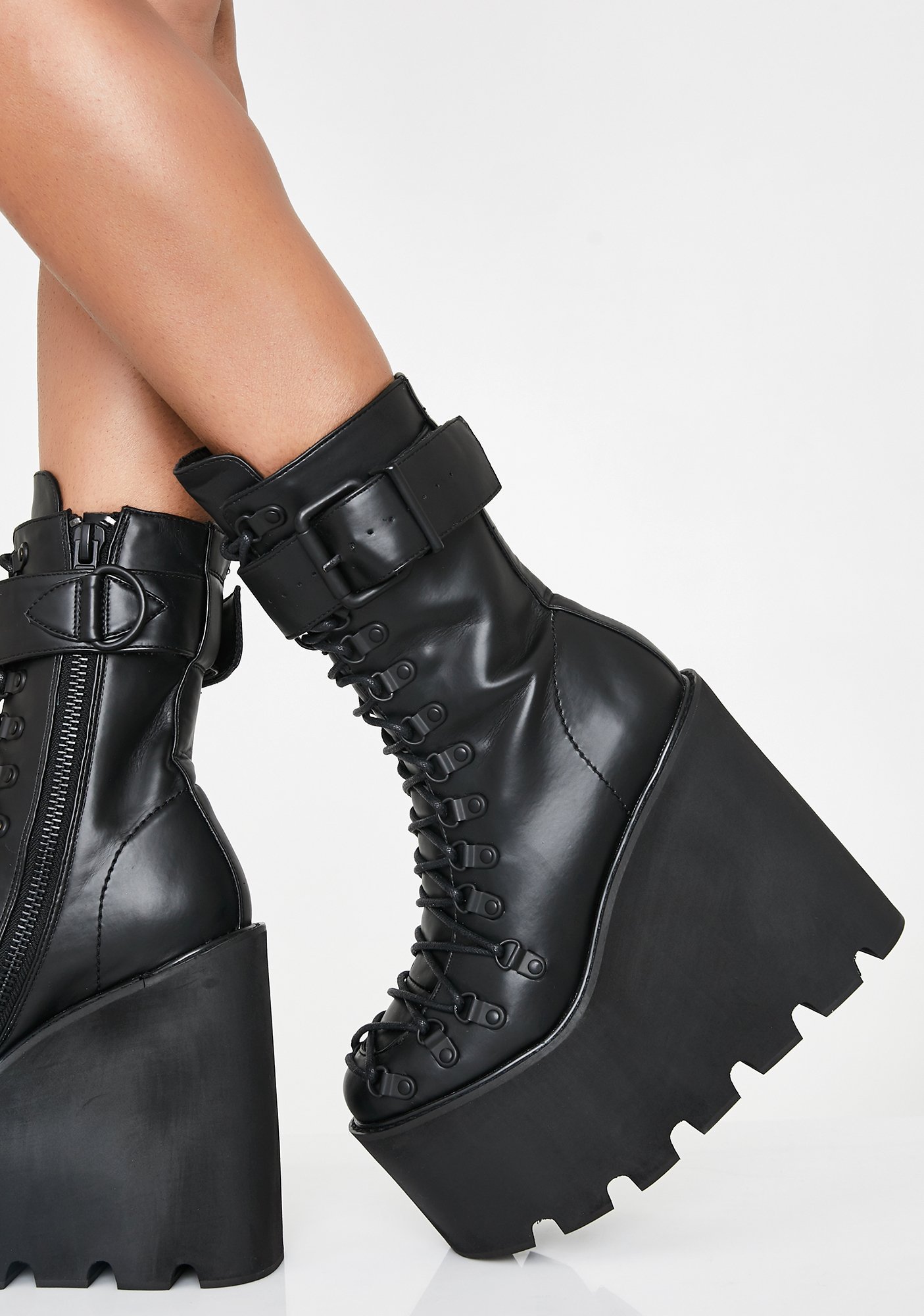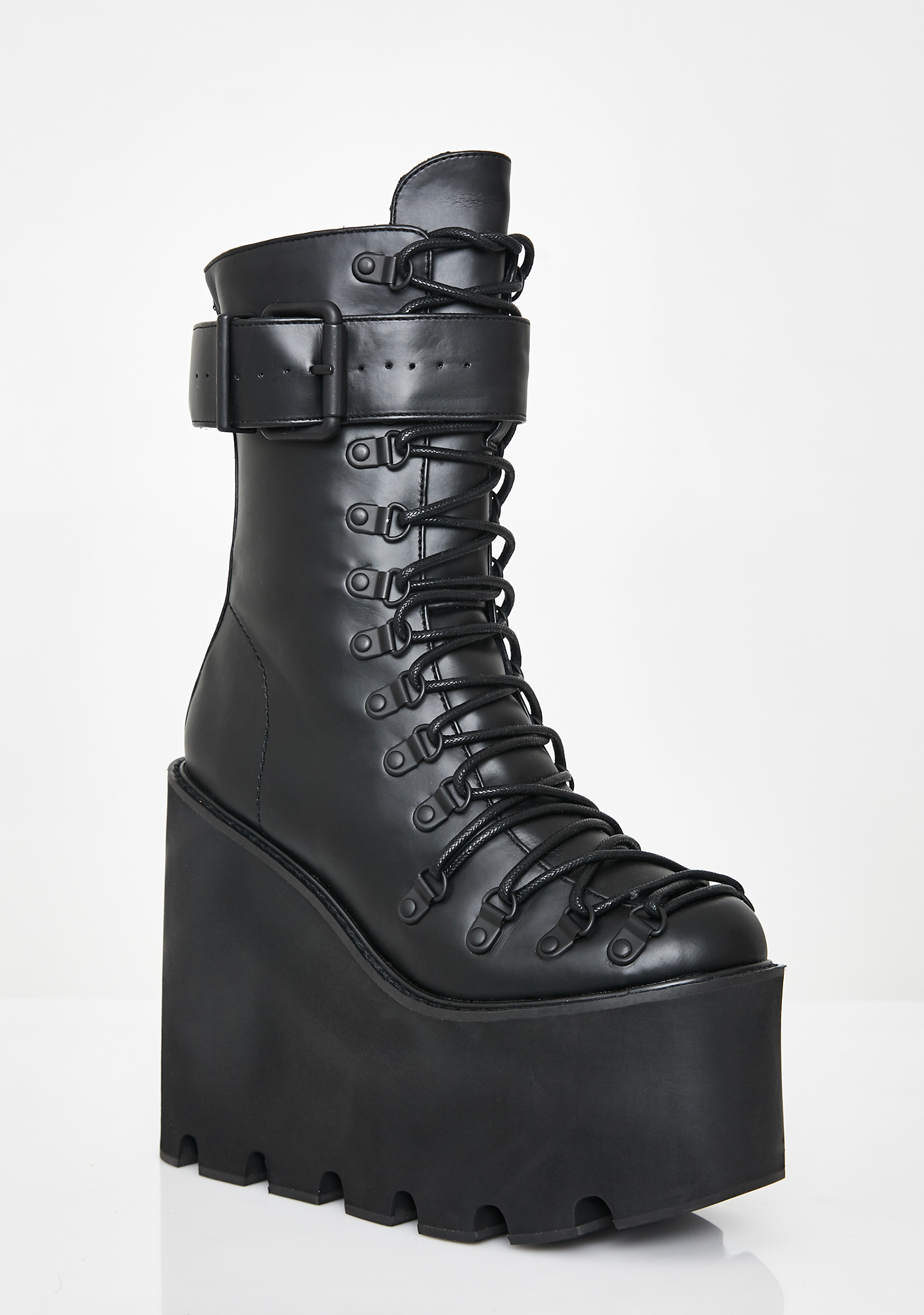 Traitor Boots cuz once ya do a double-cross, ya gotta be ready to fight! These gnarly platform boots feature a sleek black vegan leather construction, ultra high wedge heel ‘N platform with cutout tread, laces that run all the way down to tha tow, matte black hardware, wrapped calf strap with adjustable buckle, and side zip closures.