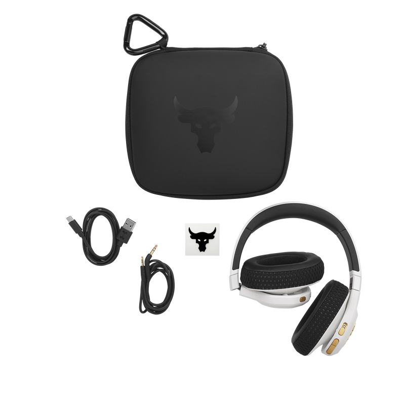 UA Project Rock Over-Ear Training Headphones are tested and approved by Dwayne Johnson himself, built to help you grind harder—with Adaptive Noise Cancelling for ultimate focus, and a durable sweatproof construction. Washable Supervent ear cushions stay dry, and UA Storm Super Grip provides maximum stability. JBL Charged Sound is tuned to maximize motivation, and Bionic Hearing features TalkThru Technology for talking to training partners, and Ambient Aware Technology to hear surroundings. Give voice assistants quick commands and customize your sound with the JBL app. With up to 45-hours of playtime and a hardshell case there's nothing that will hold you back.