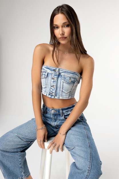 Medium-wash denim buttoned tube top