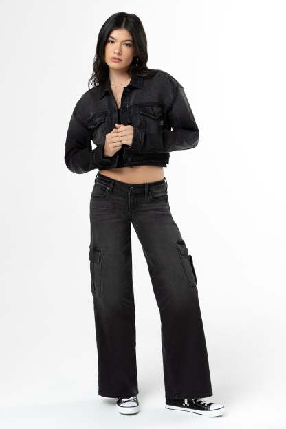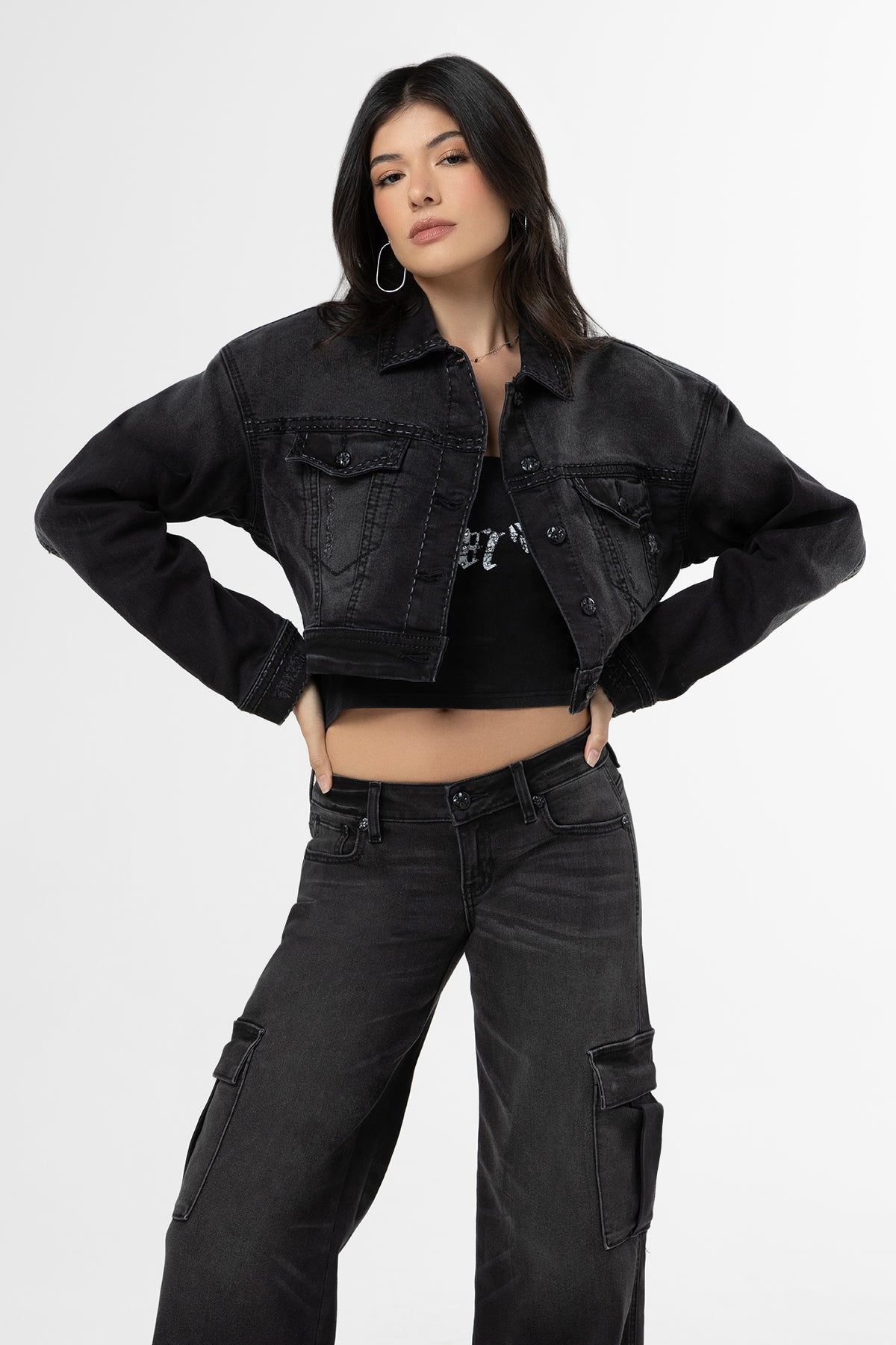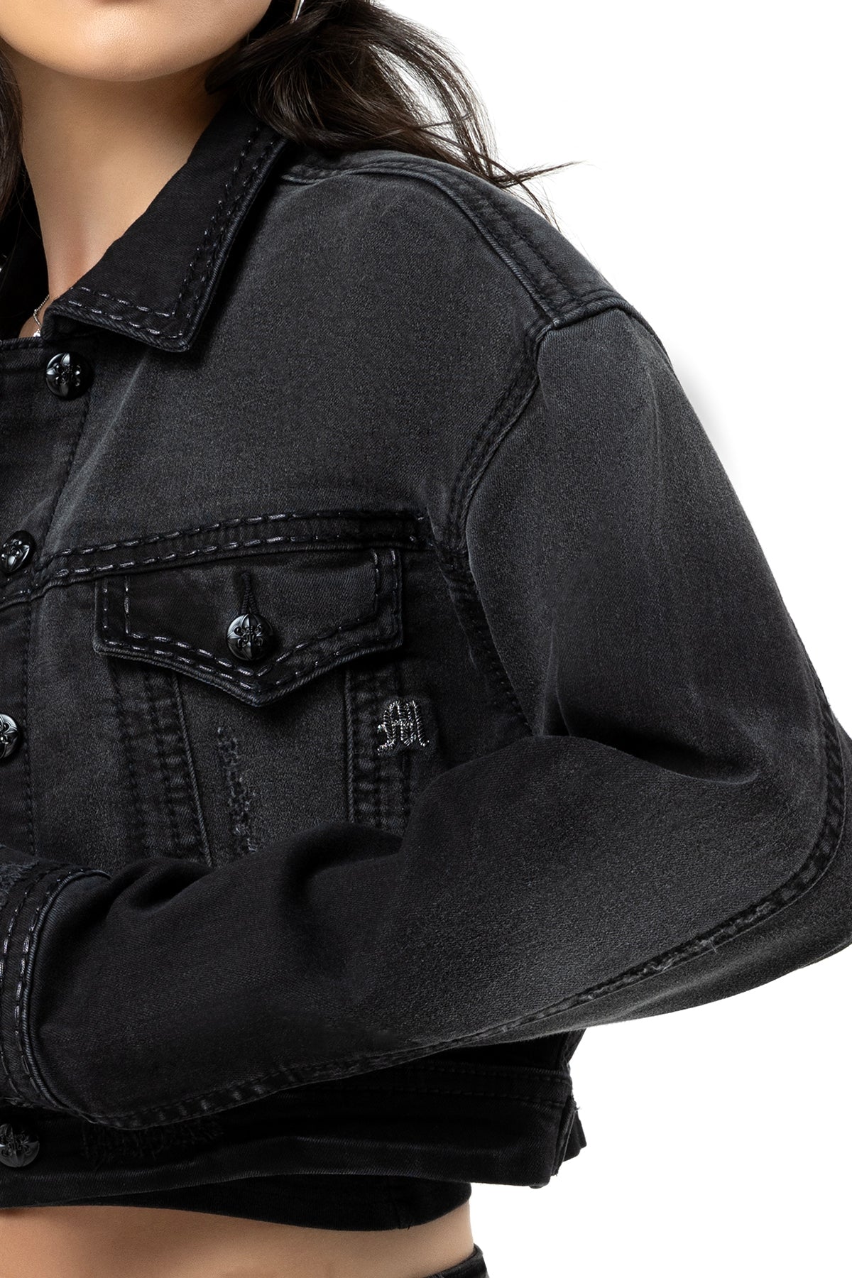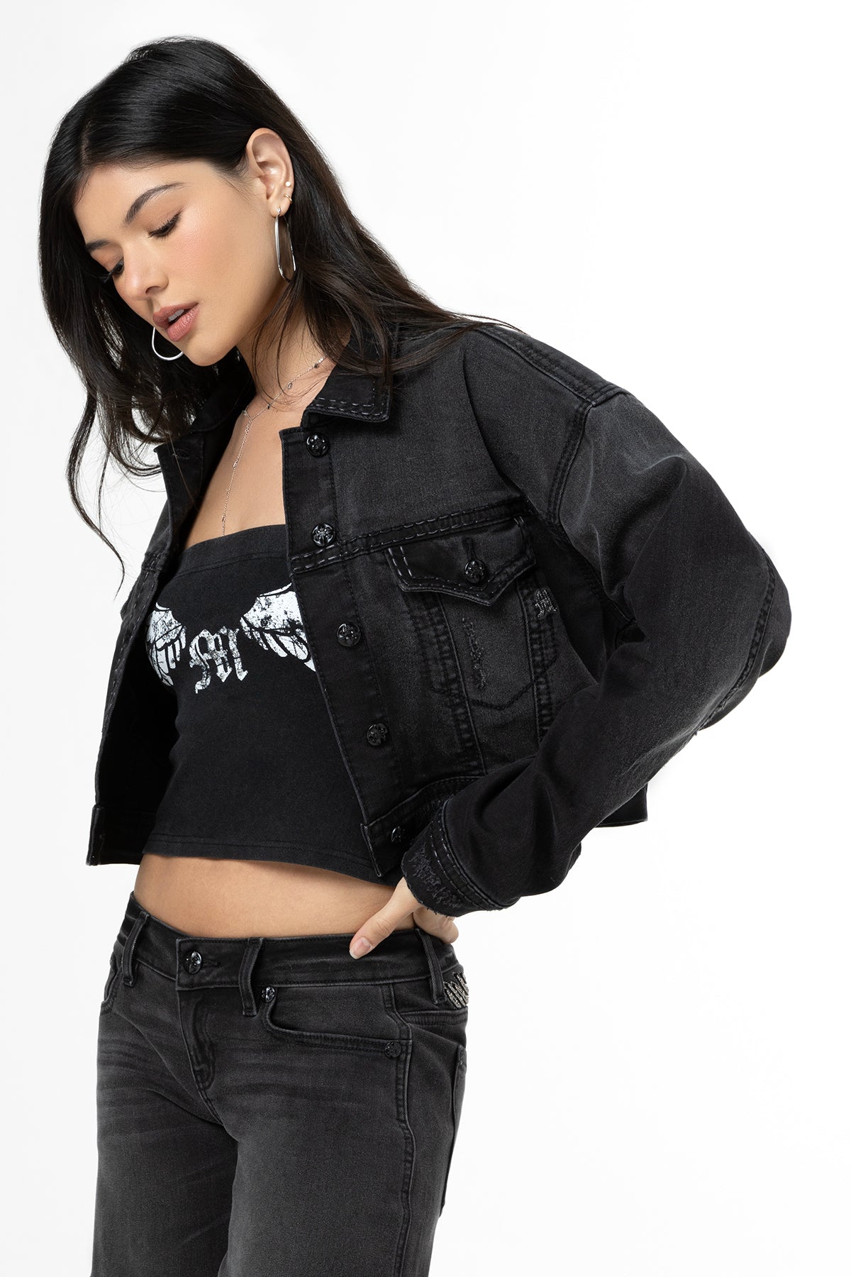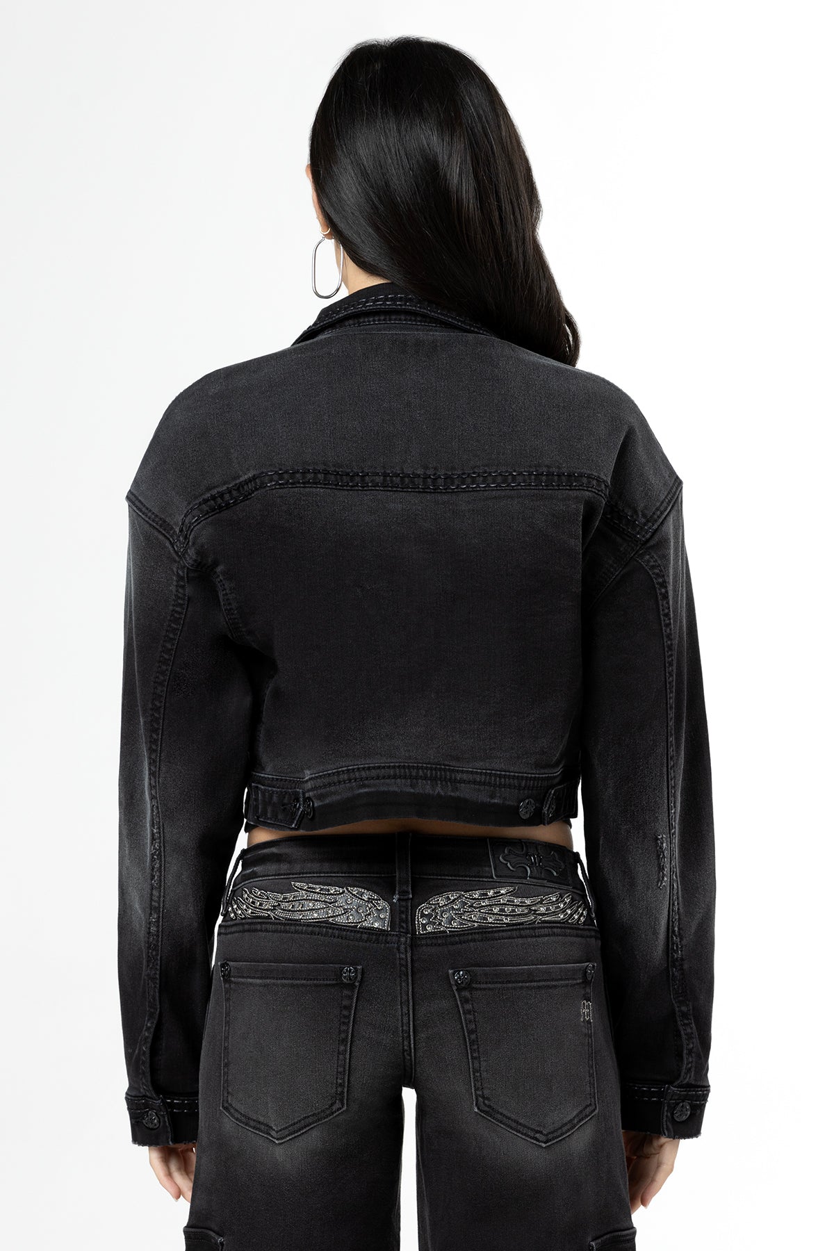 - Metallic silver embroidered mini Miss Me logo front pocket design