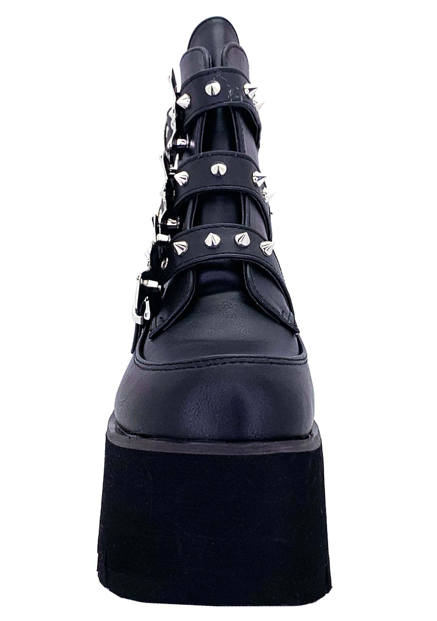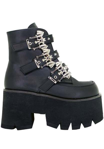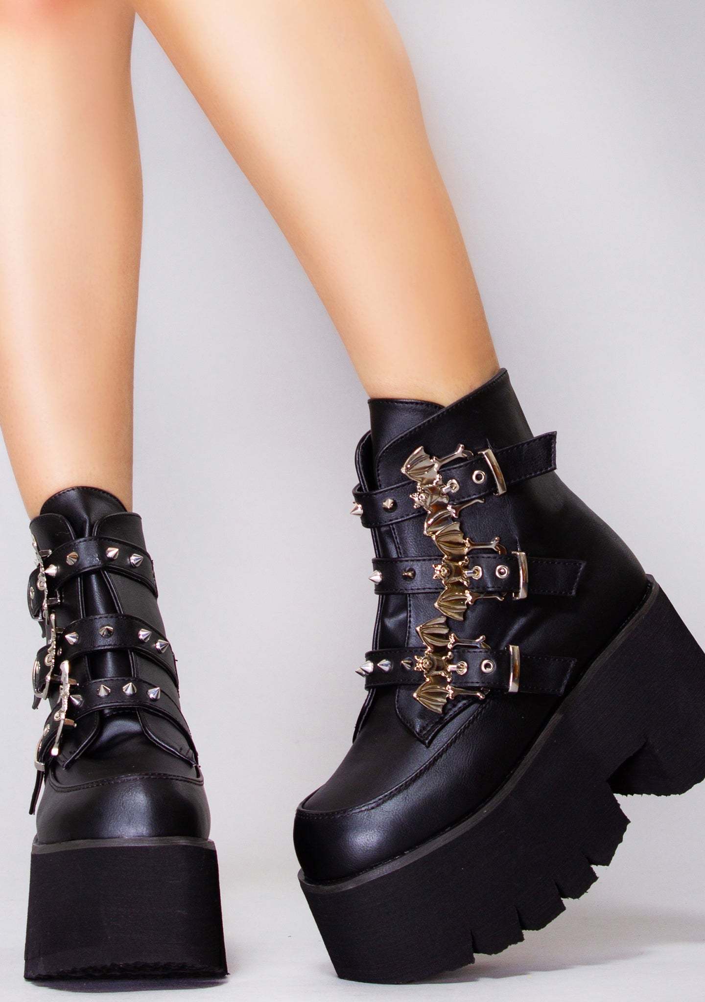Platform Boots. Made with premium quality vegan leather, these wicked festival boots feature sinful all-over stud accents, arresting silver toned hardware, staggering bat buckle details, strappy style closure and chunky platform heel. These vampy rave boots will have you flyin’ high through the night.