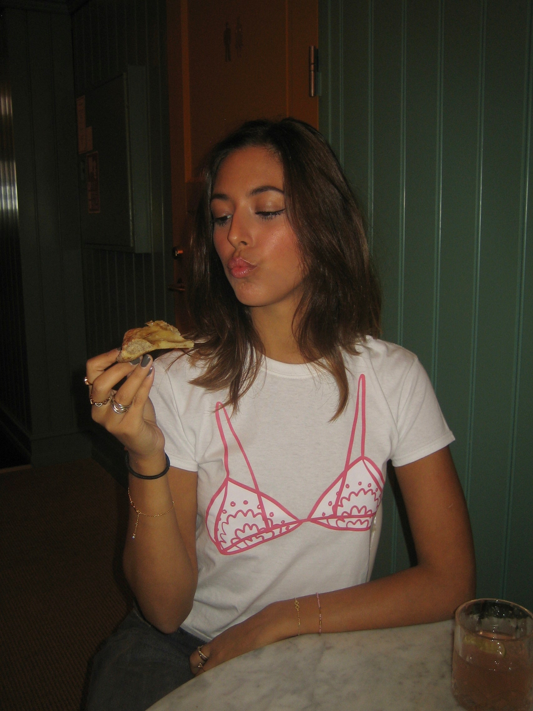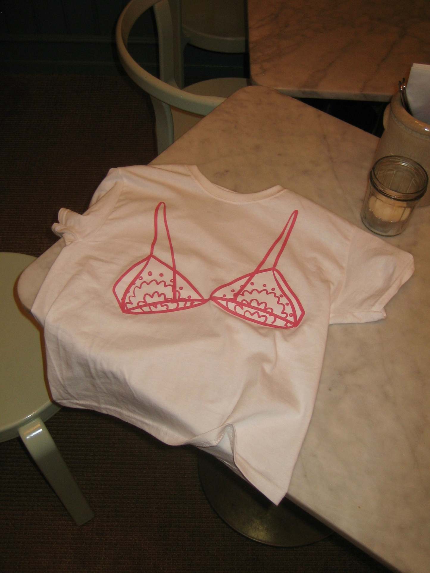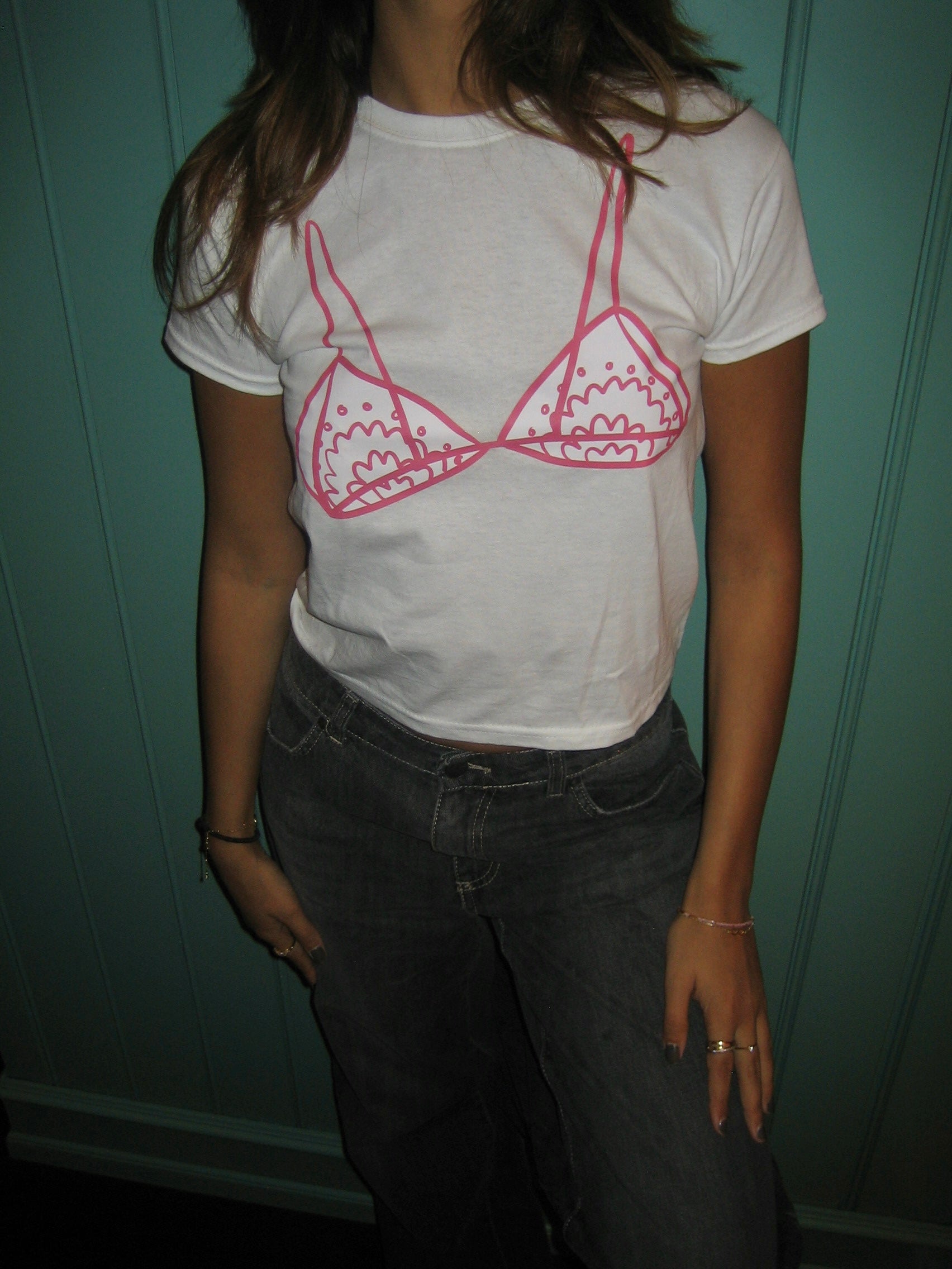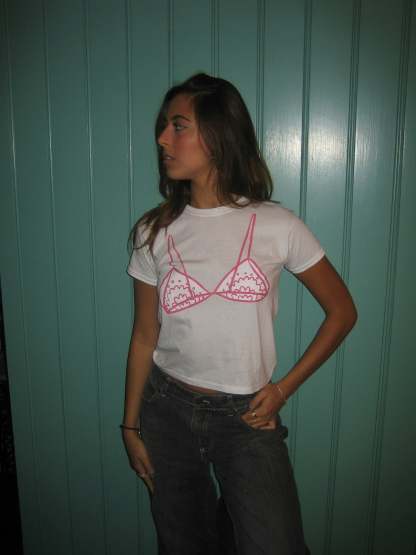 Baby tee with a "bralette" on it. Our tees are from fruit of the loom and in a super soft and comfortable quality.
