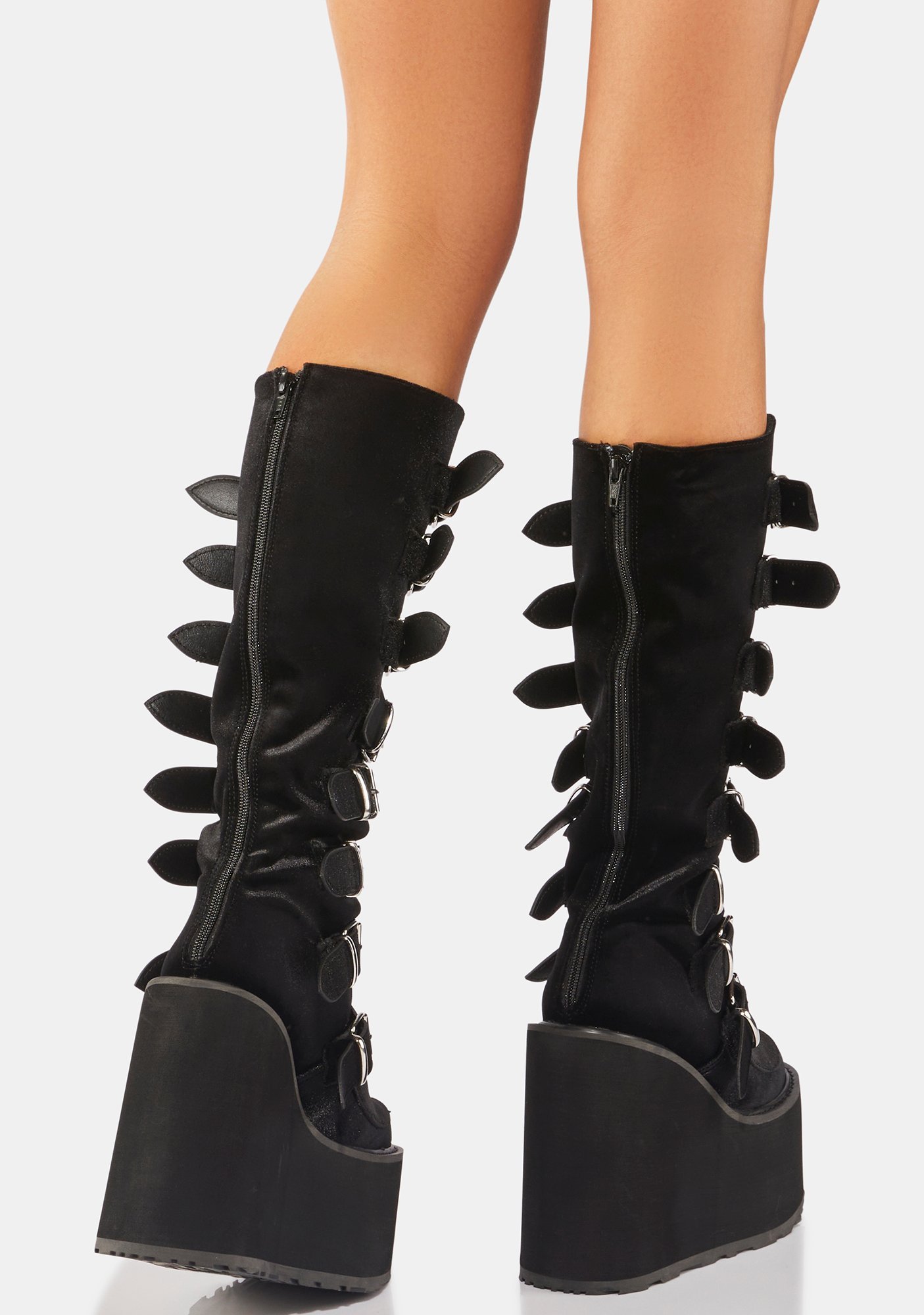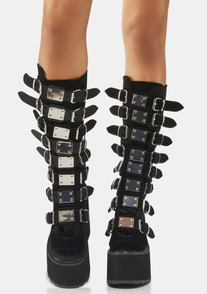 Black Velvet Trinity Boots cuz you’re from a different planet. These knee high platform boots have a velvet construction, tons of adjustable buckle straps with metal plate details, and back zip closures.