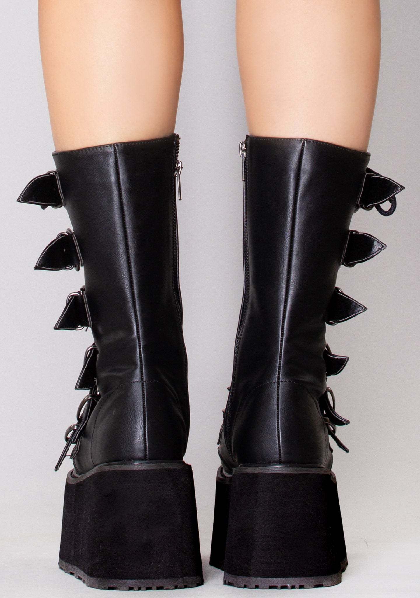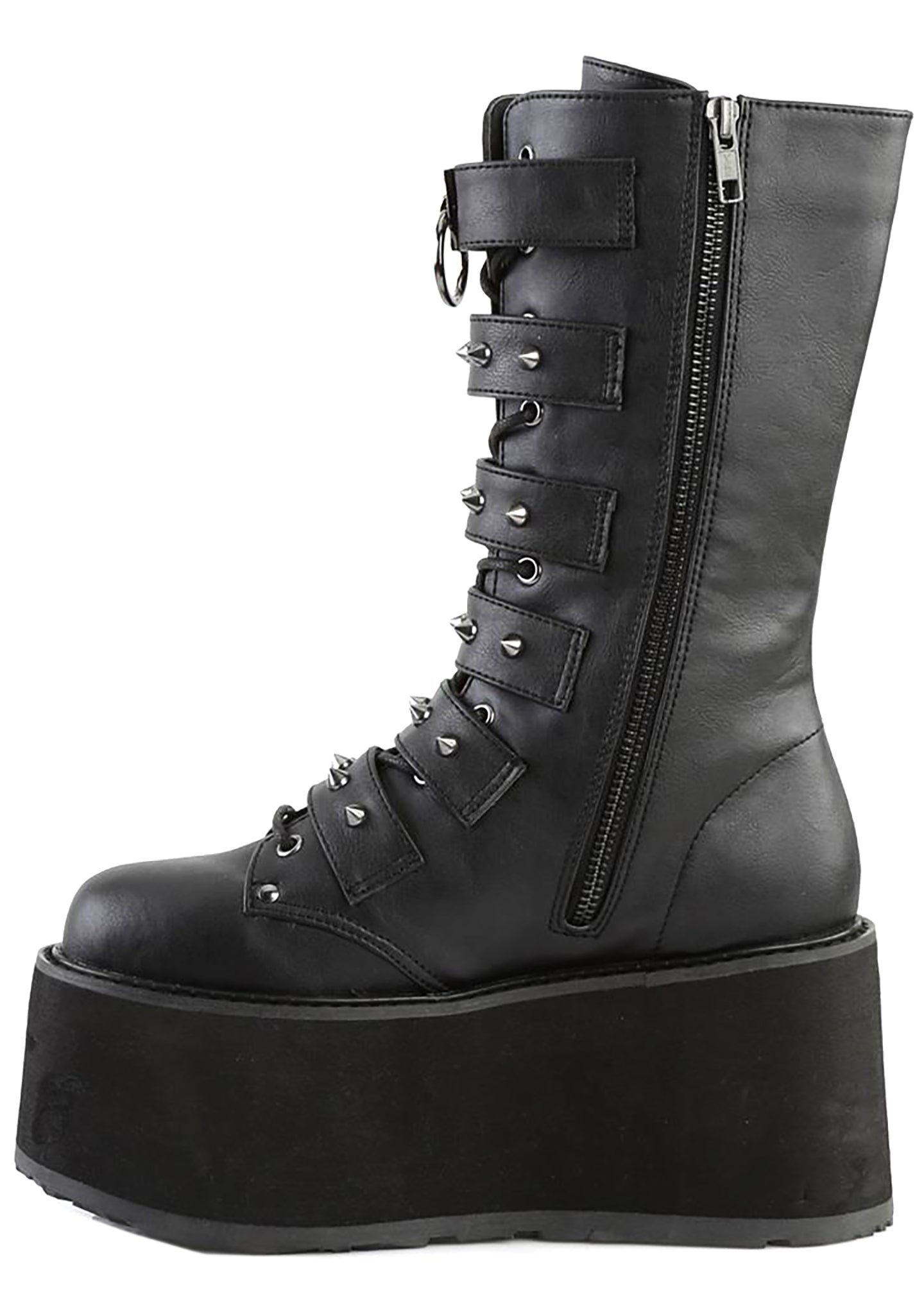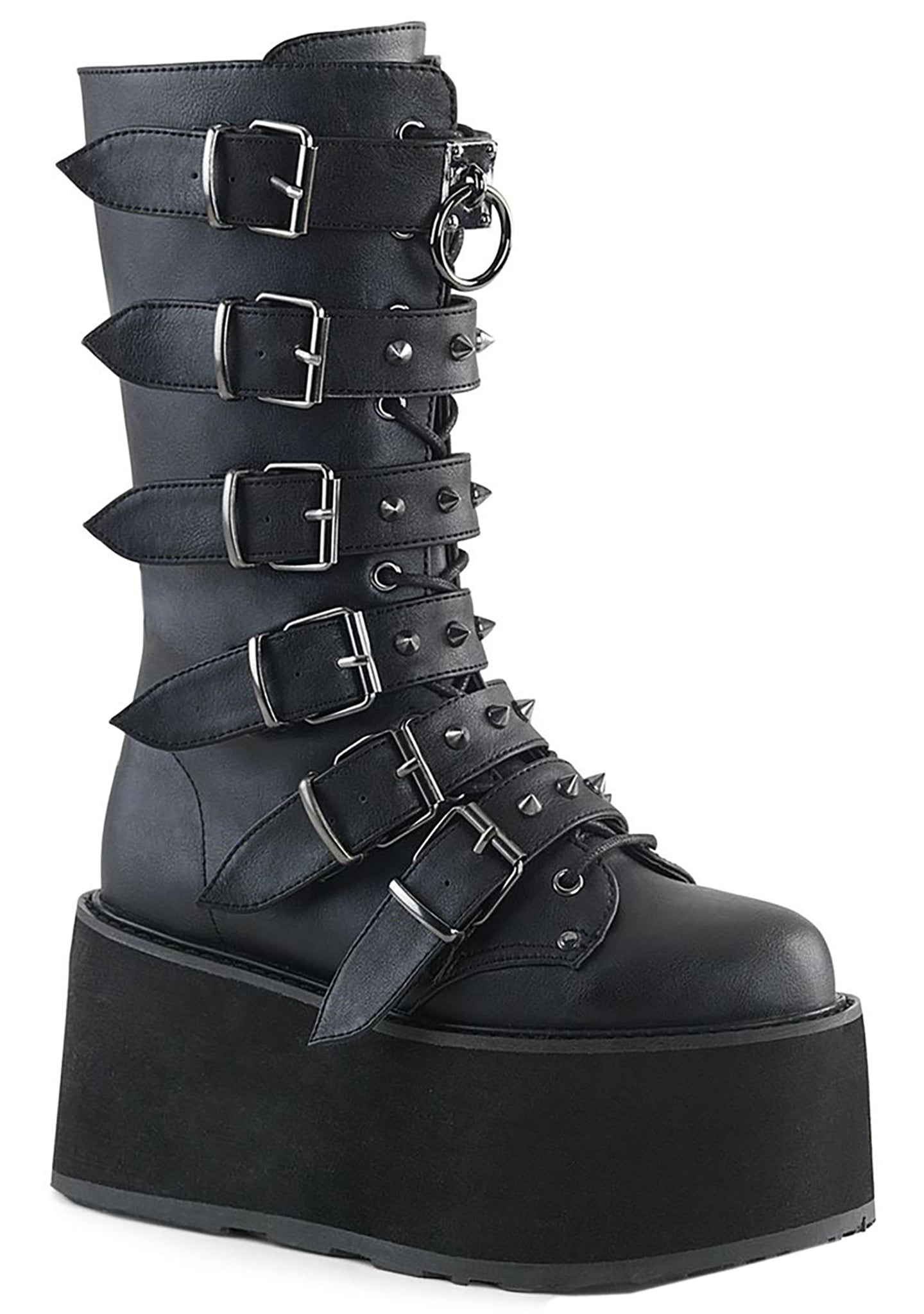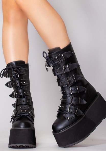 Platform Boots by Demonia. These sinful rave boots feature a black vegan leather base, six spiked studded buckle straps, metal zip closure, and black contract EVA foam platforms. For those that like their boots as dark as their soul.
