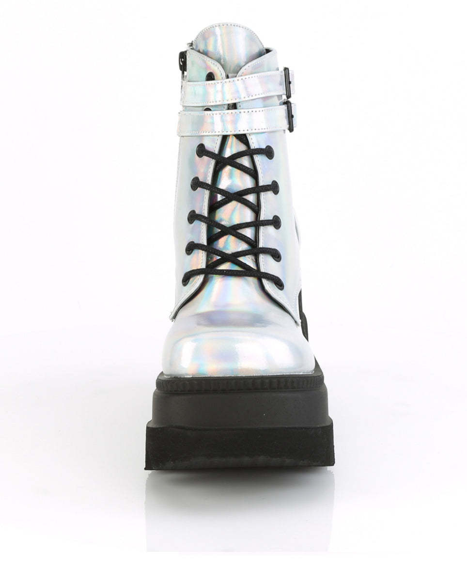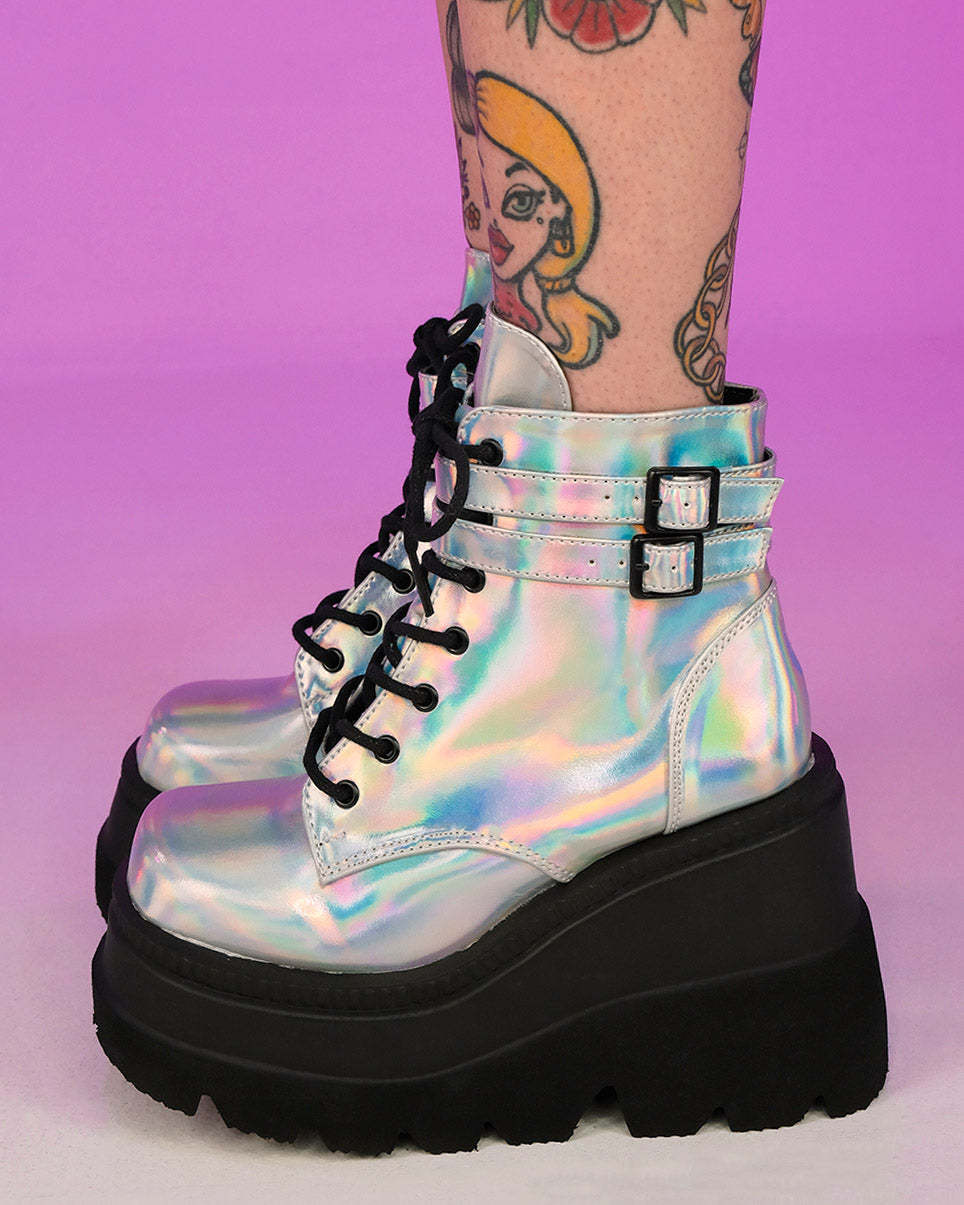 4 1/2" (114mm) Tiered Platform Lace-Up Front Ankle Boot Featuring Double Grommet Buckle Straps, Inside Zip Closure