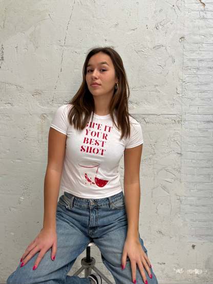 Baby tee with red "give it your best shot" writing and shot glass and lemon. Our tees are from fruit of the loom and in a super soft and comfortable quality.