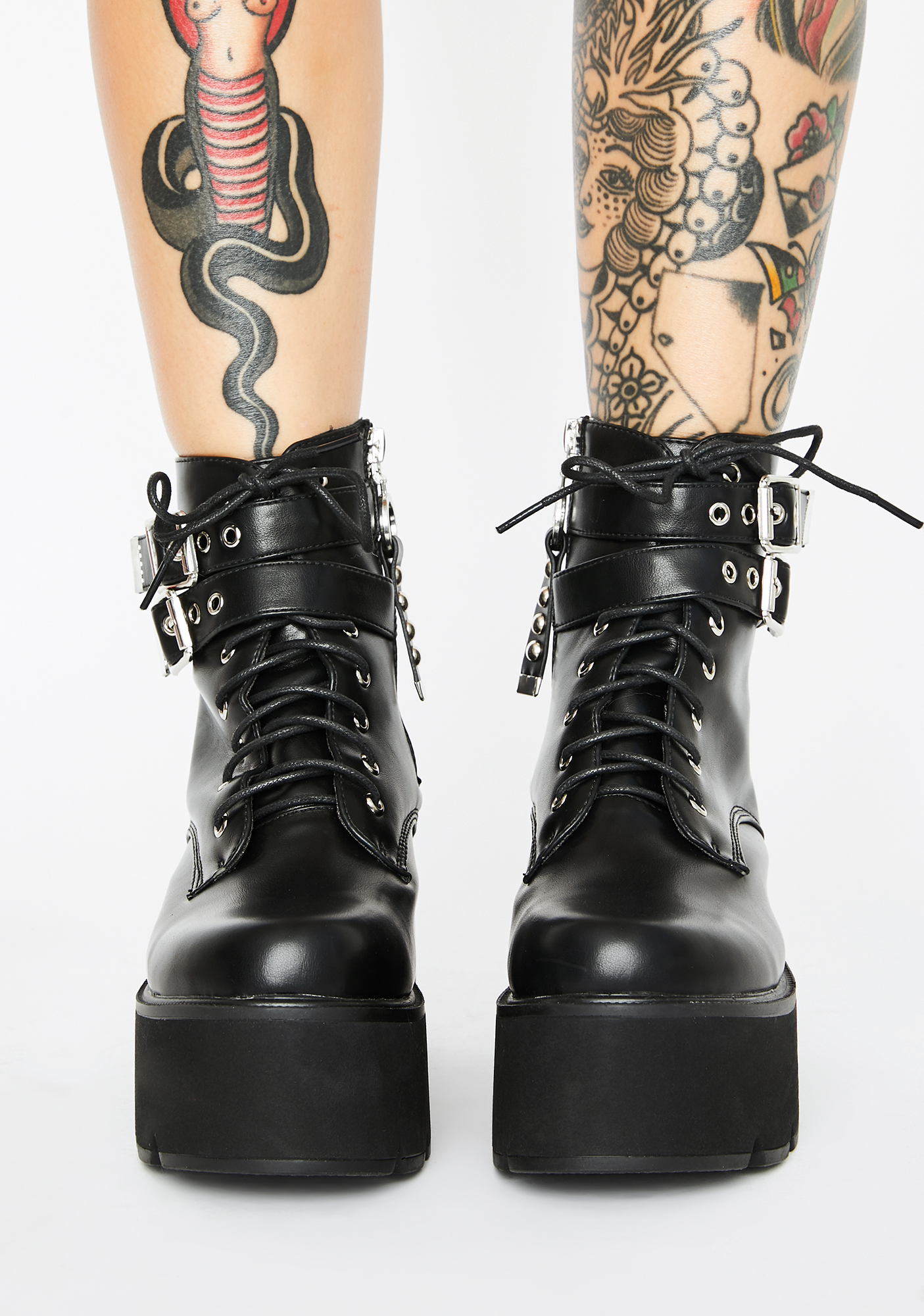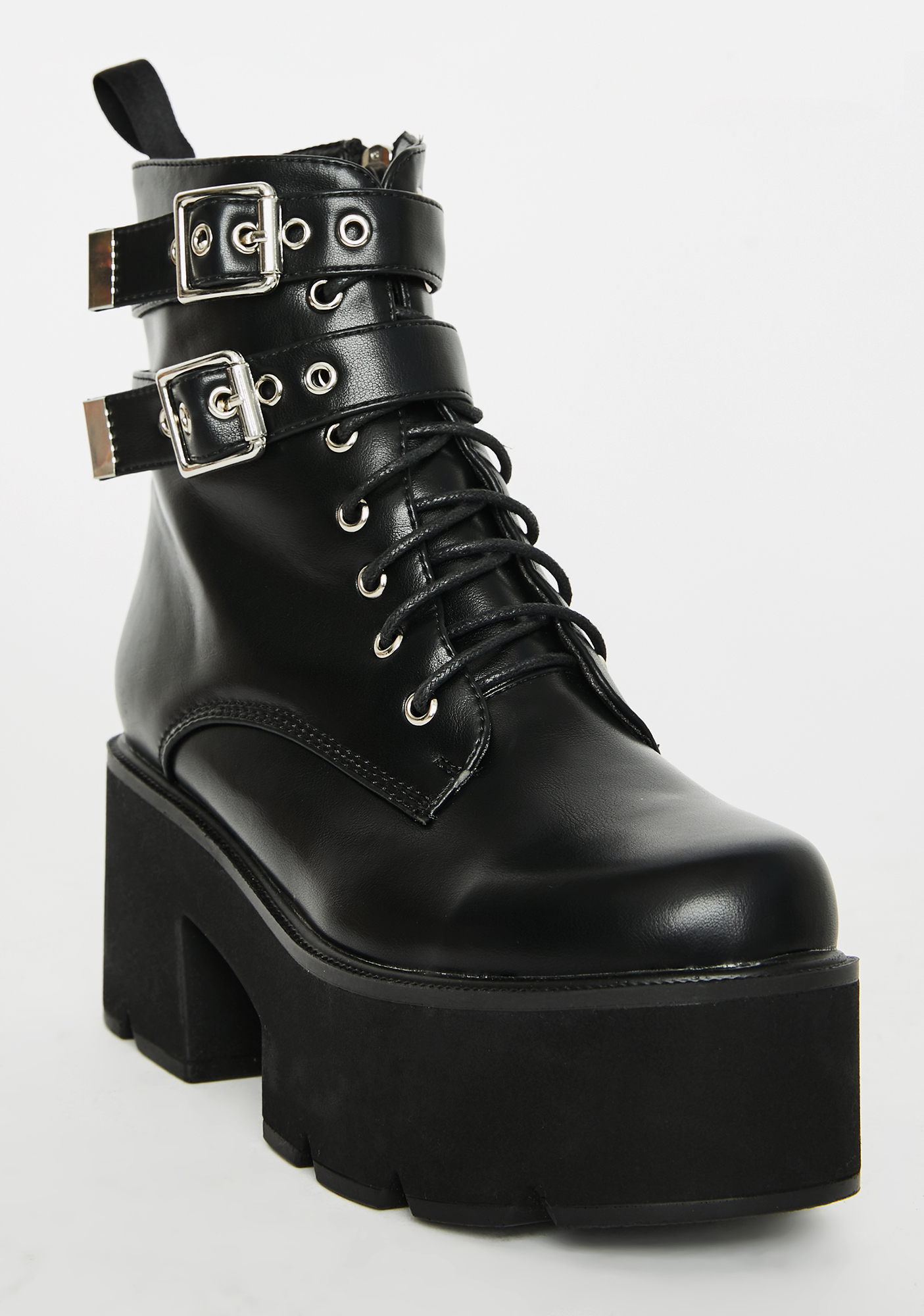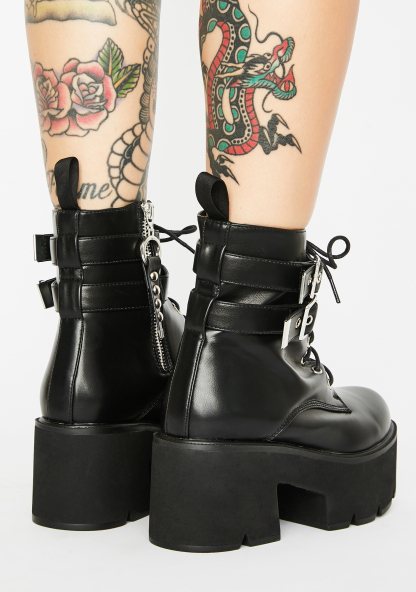 Goin' Rogue Platform Boots ain’t no taming you, babe. Look punk AF in these dope ankle boots that have a supa sleek material, wrap buckle straps, front lace up closures N’ O-ring side zip closures.