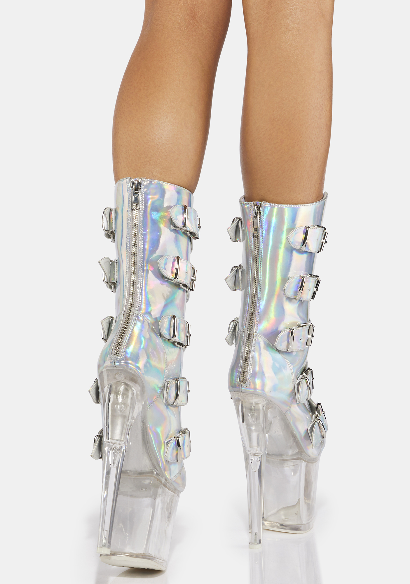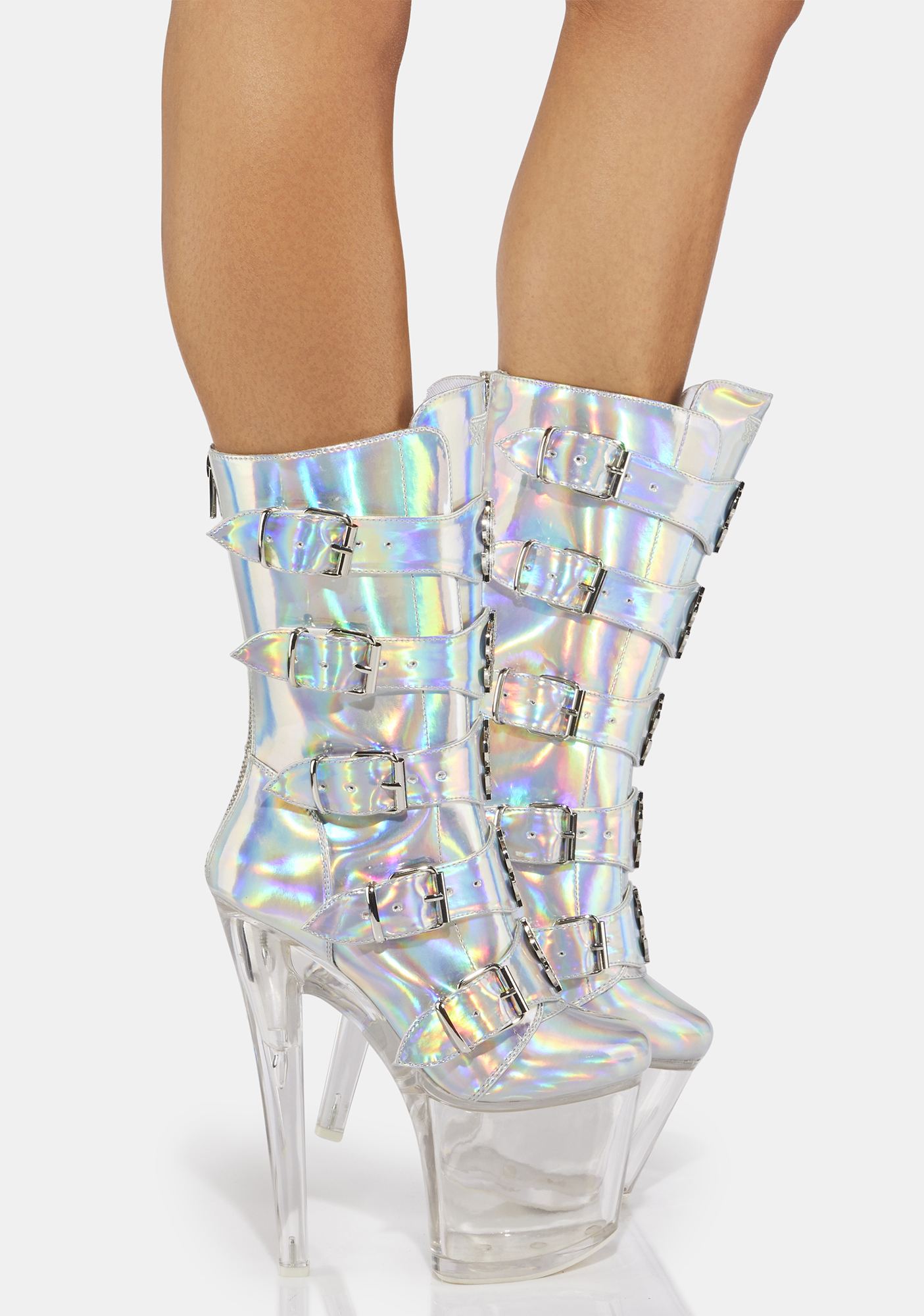 Holographic VIP Platform Boots cuz you’ve got the money honey! These platform stiletto boots have a holographic construction with clear bottoms, adjustable buckle straps with rhinestone dollar sign charms, back zip closures, and logo details on the tongues.