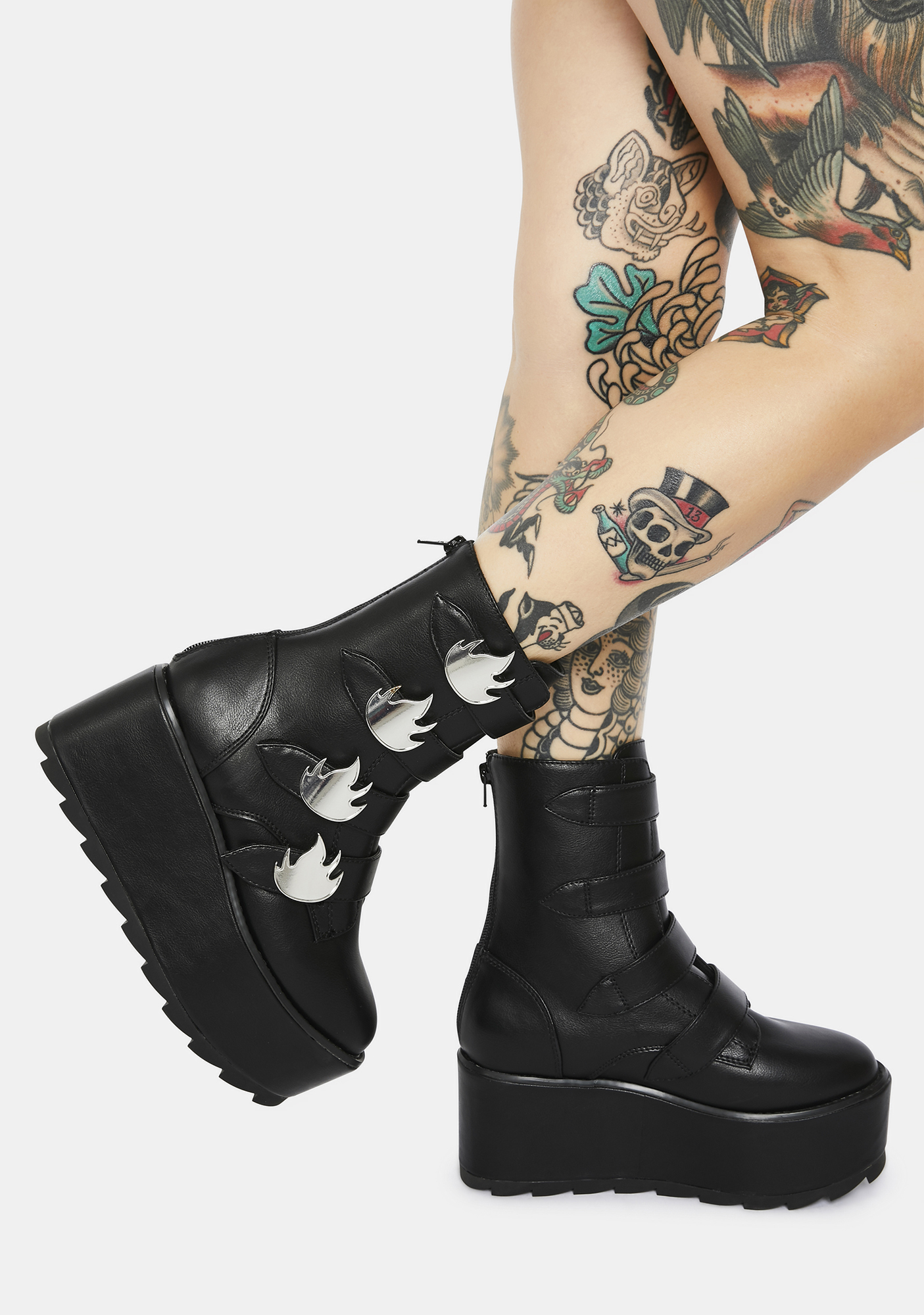 Karma Flame Platform Boots cuz you’re too hot to handle. These vegan leather platform boots have back zip closures and adjustable velcro straps with chrome flame hardware.