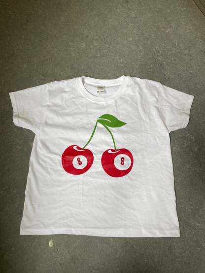 Baby tee with a large 8-ball cherry. Our tees are from fruit of the loom and in a super soft and comfortable quality.