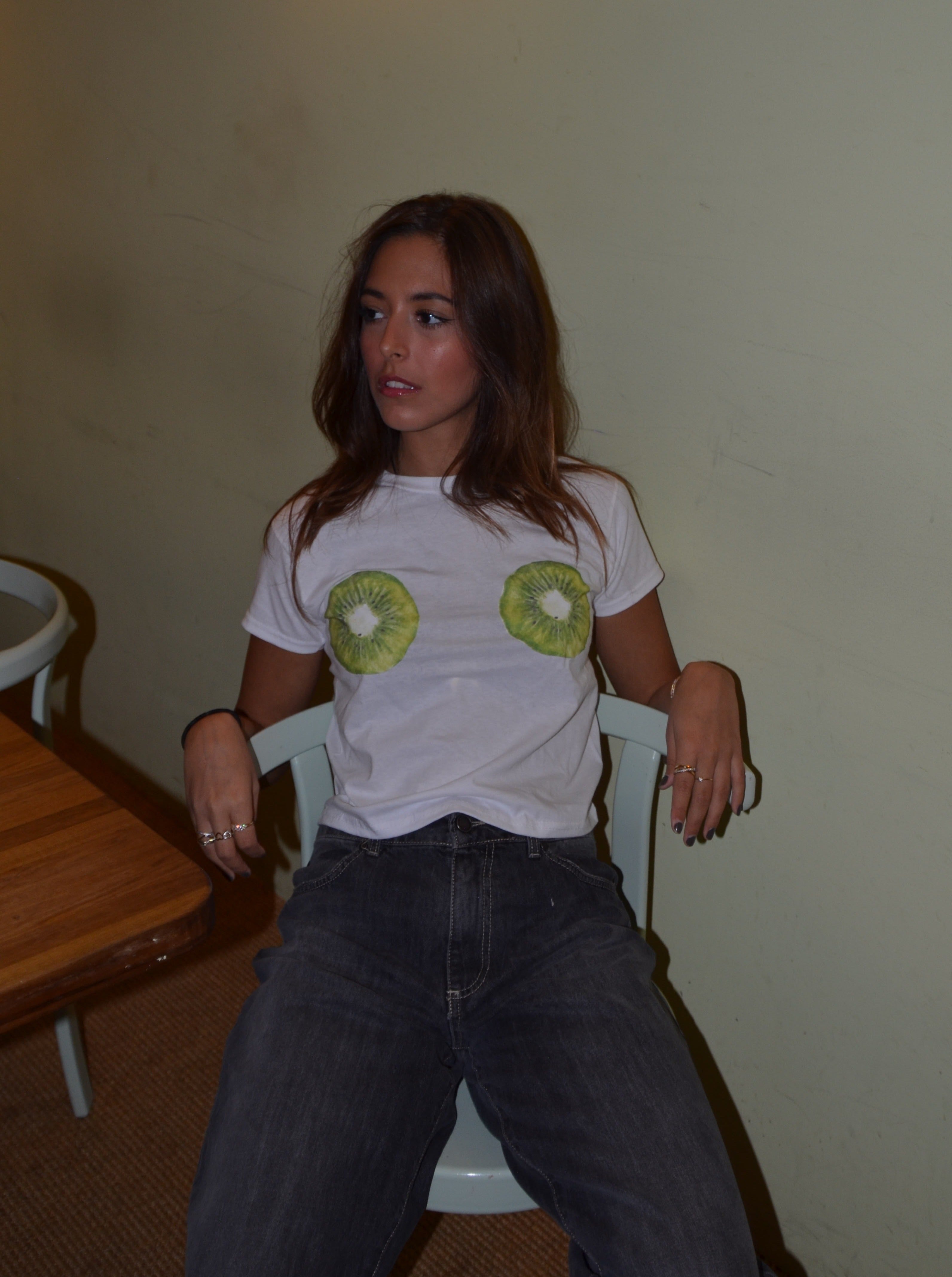 Baby tee with a print of kiwis placed on the chest. Our tees are from fruit of the loom and in a super soft and comfortable quality.