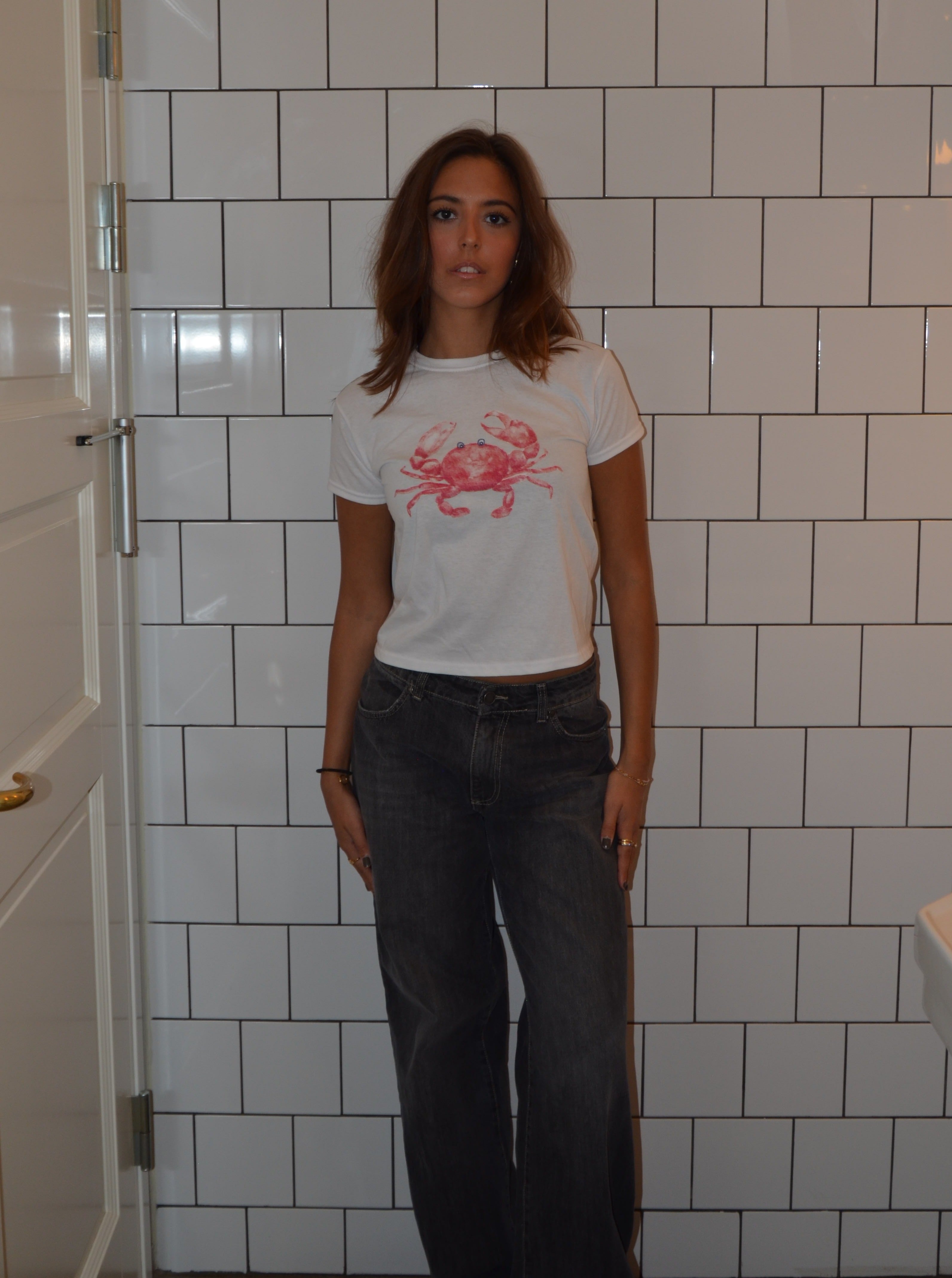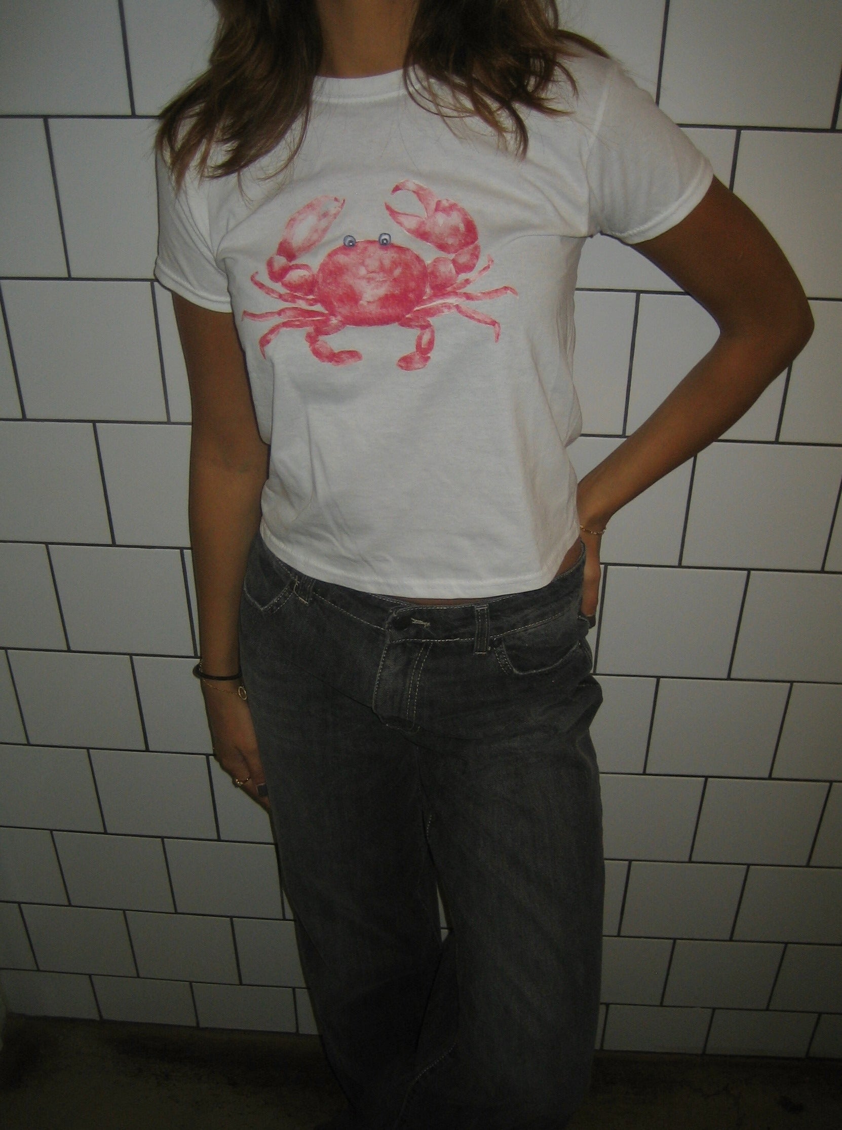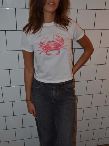 Baby tee with a "crab" on it. Our tees are from fruit of the loom and in a super soft and comfortable quality.