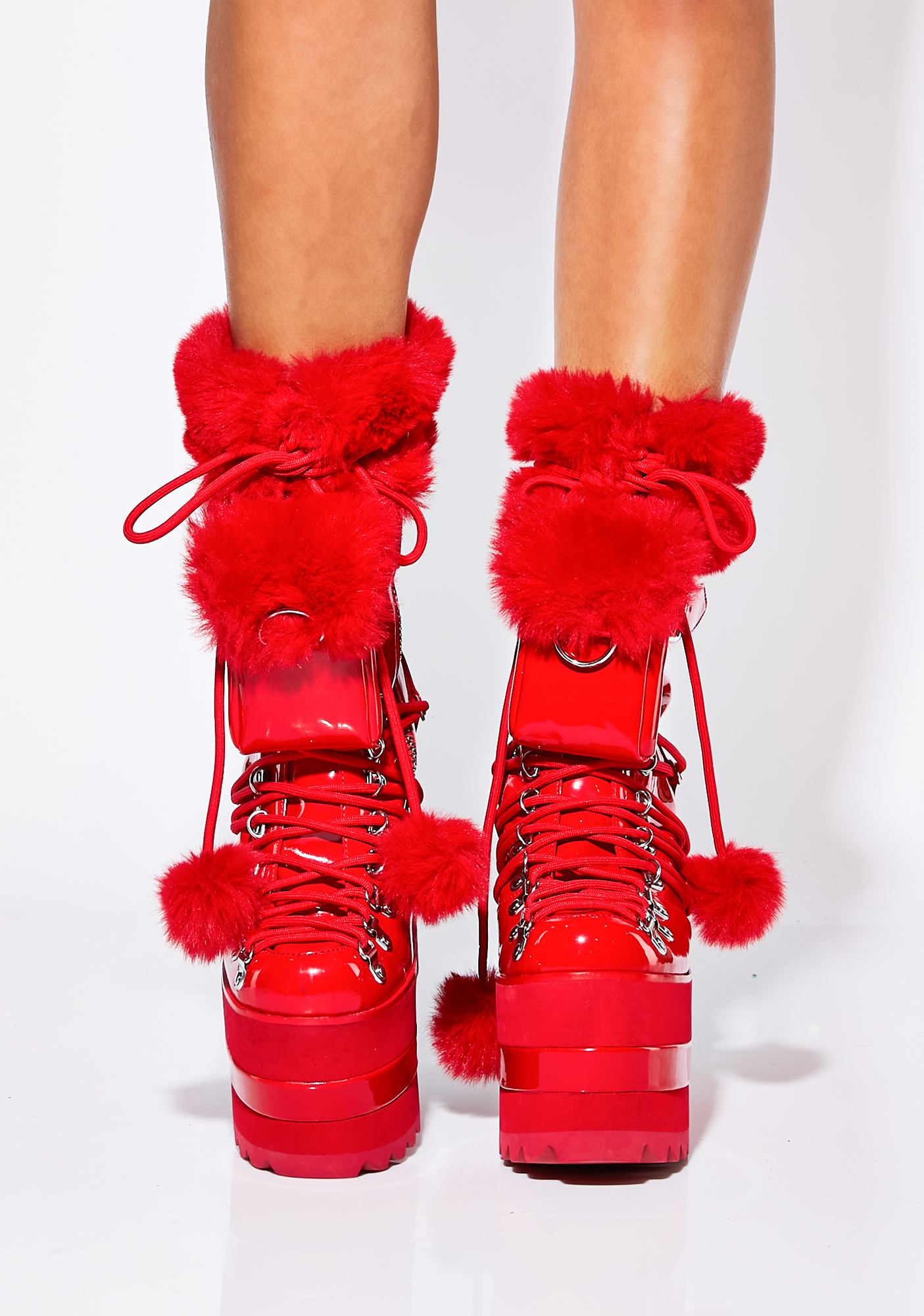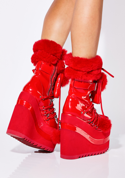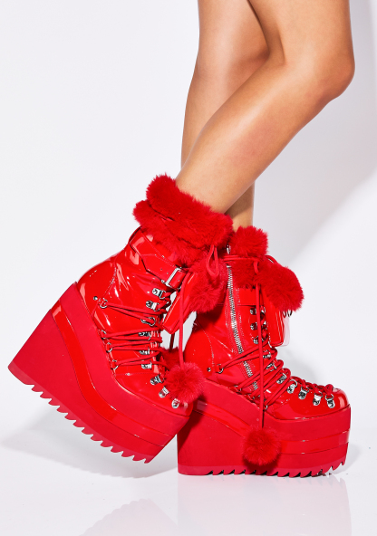 Moment Of Love Traitor Boots cuz it’s your sweet disposition. These wedge platform boots have a patent vegan leather construction, adjustable lace-ups with D-ring hardware, faux fur trim with pom pom ties, side zip closures, and detachable mini pockets with buckle strap details.