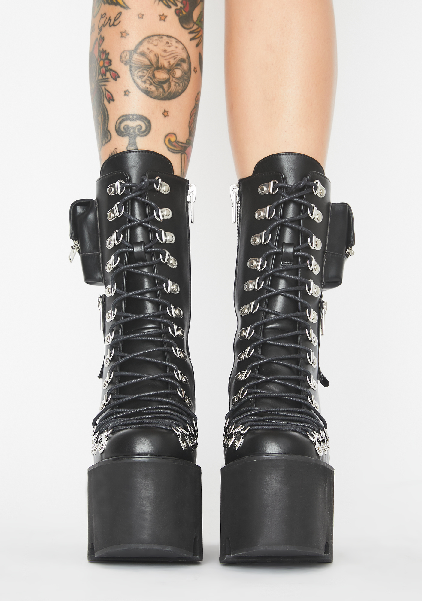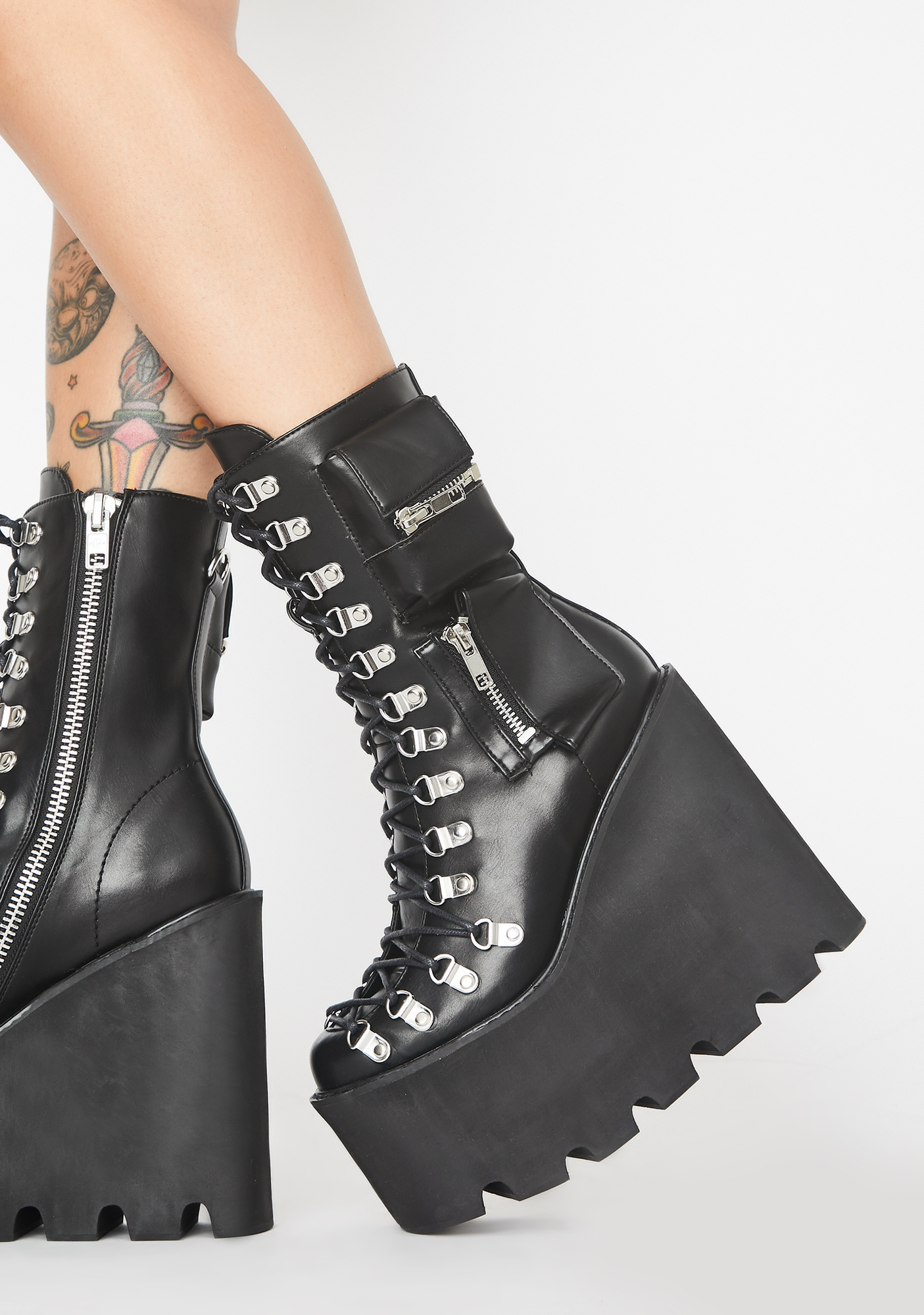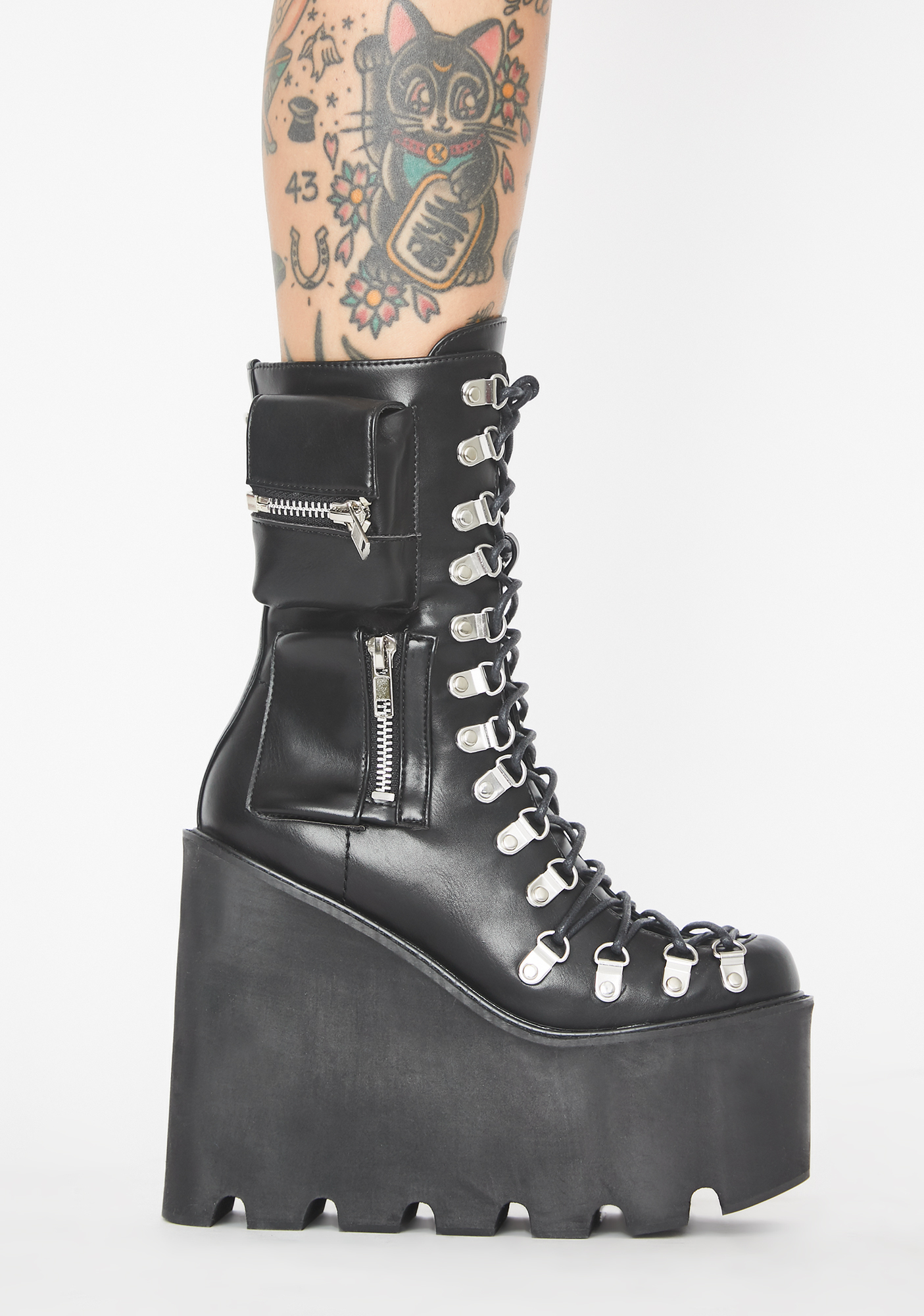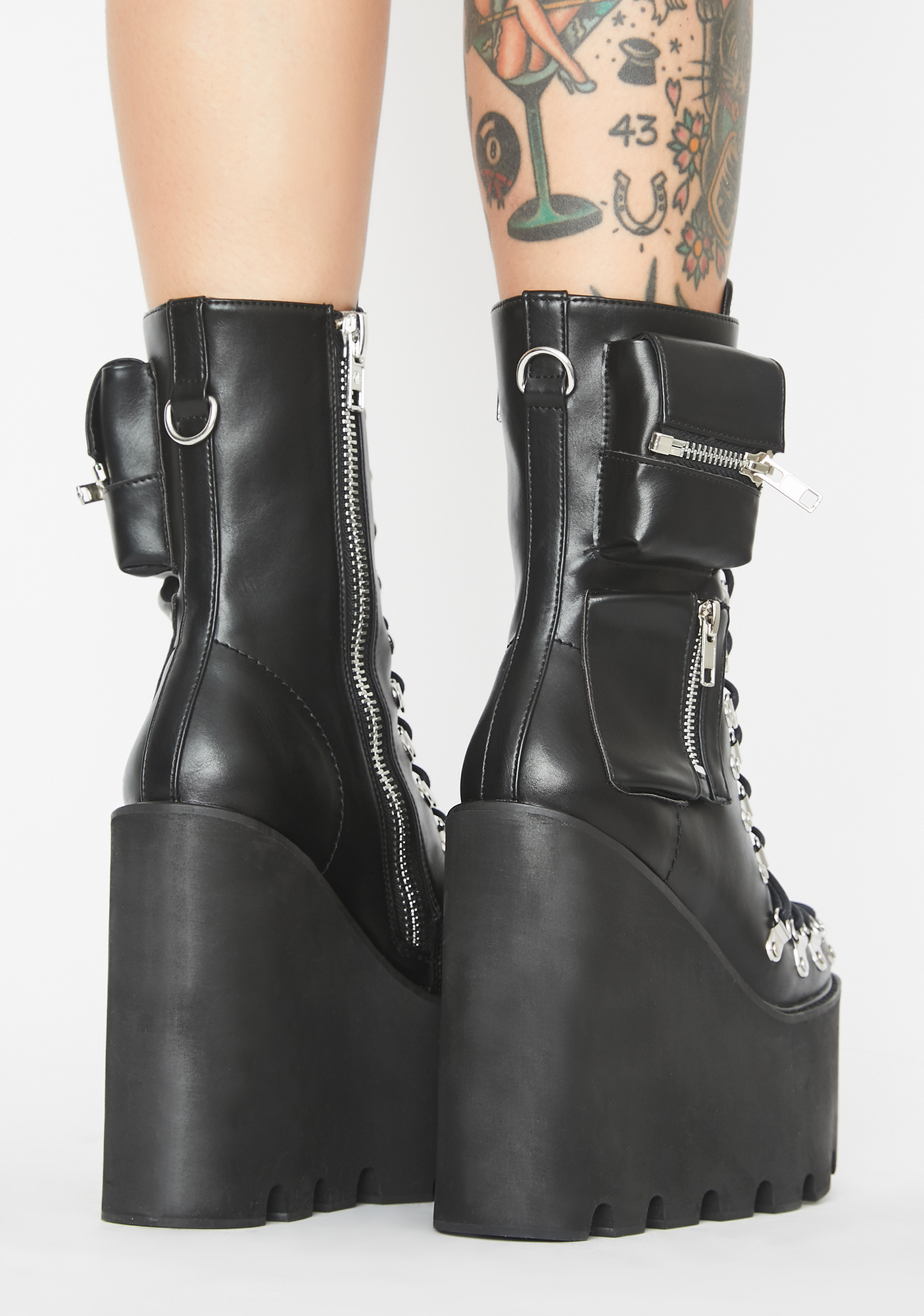 Obsidian Pocket Traitor Boots will have you stomping all ova the battle groundz. It’s winner takes all in these platform wedge boots that have adjustable lace-ups, side zip closures, D-ring hardware N’ zippered stash pockets to hide your secret weaponz.