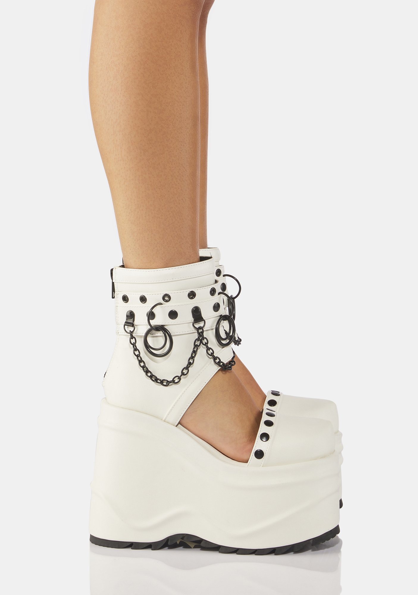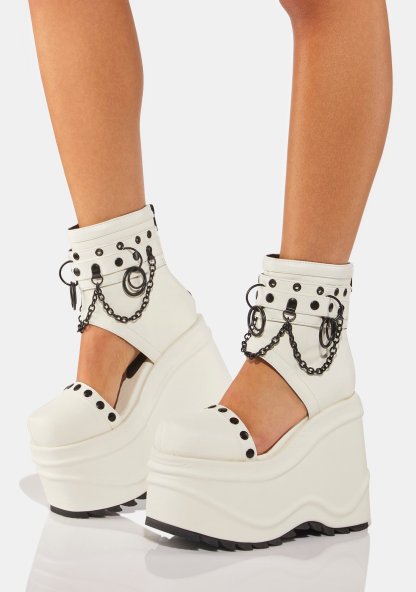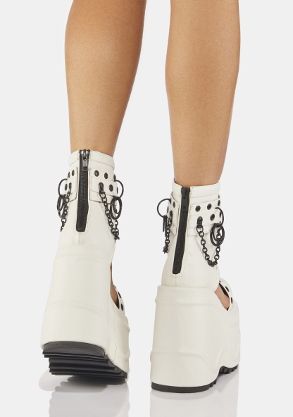 Pure Heart Wedge Ankle Boots have a vegan leather construction with stud \u0026 eyelet detailing, draped chains \u0026 O-ring accents, chunky wedge soles, and back zip closures.