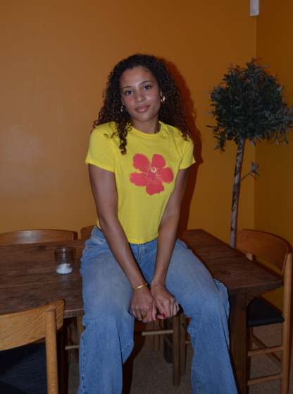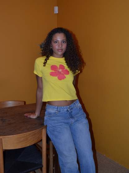 Baby tee with a "hibiscus" on it. Our tees are from fruit of the loom and in a super soft and comfortable quality.