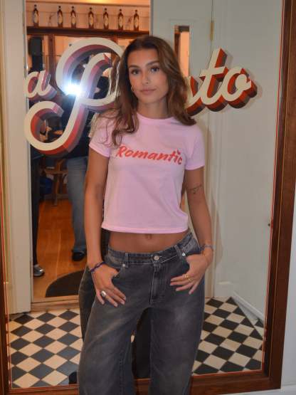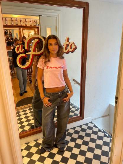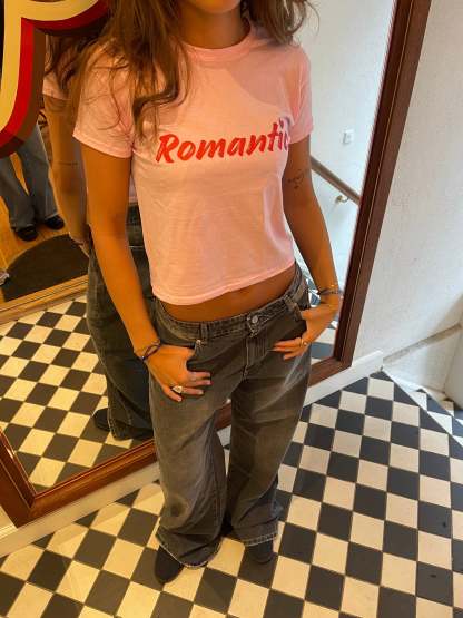Baby tee with the text "romantic" on it. Our tees are from Fruit of the Loom and made from super soft and comfortable quality.