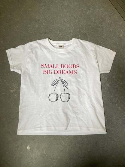 Baby tee with the text "small boobs big dream" and a big cherry. Our tees are from fruit of the loom and in a super soft and comfortable quality.