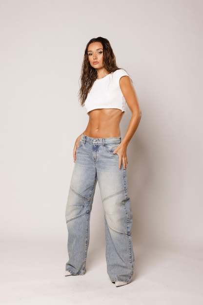 The Jet Pant will be your new favorite baggy pant. This low-rise jean gives you the ultimate model-off-duty look with its vintage-inspired light wash. Pay close attention to the intricate details on the front of the pant - featuring a knee break design.