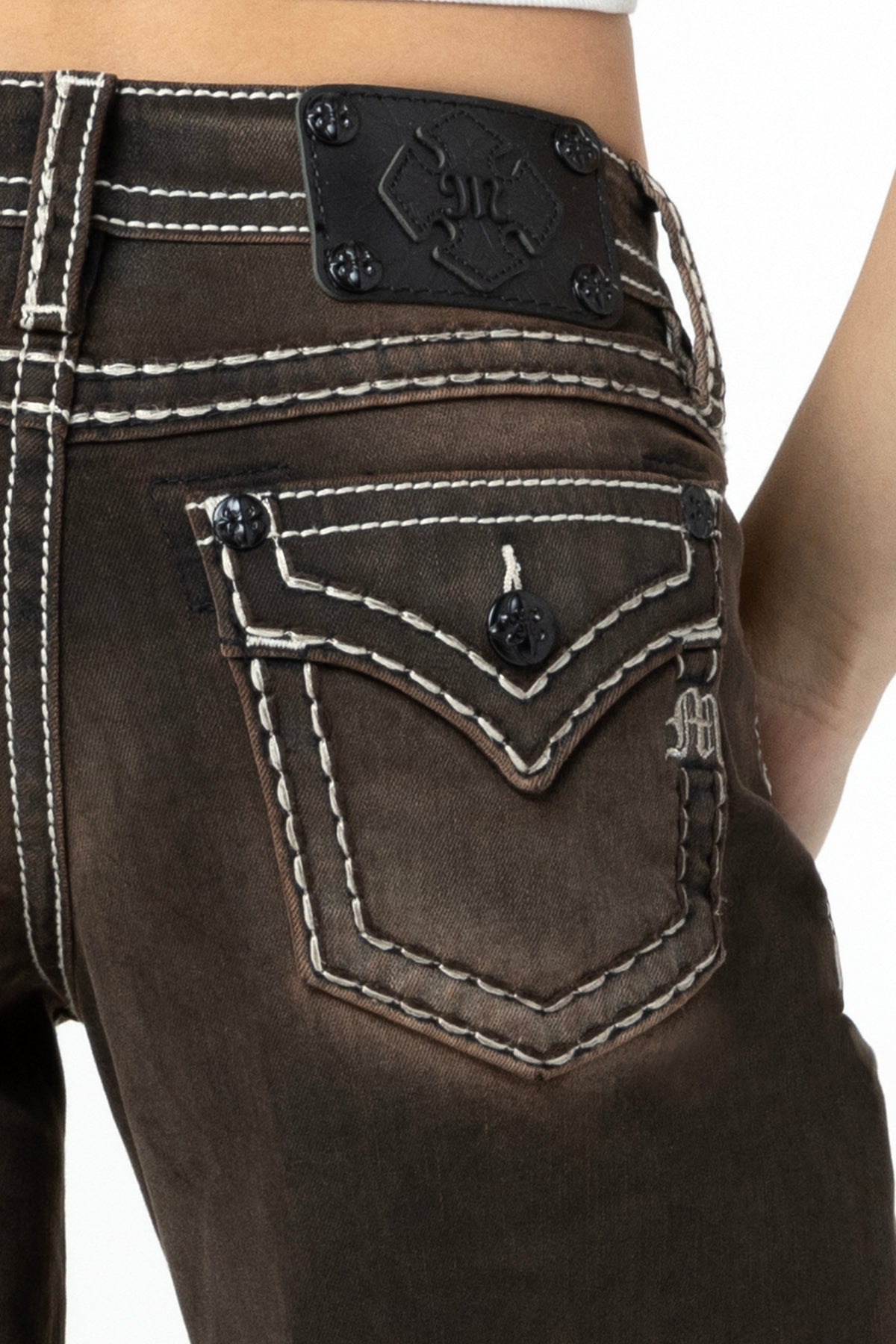 - Faux flap pocket with mini silver Miss Me logo